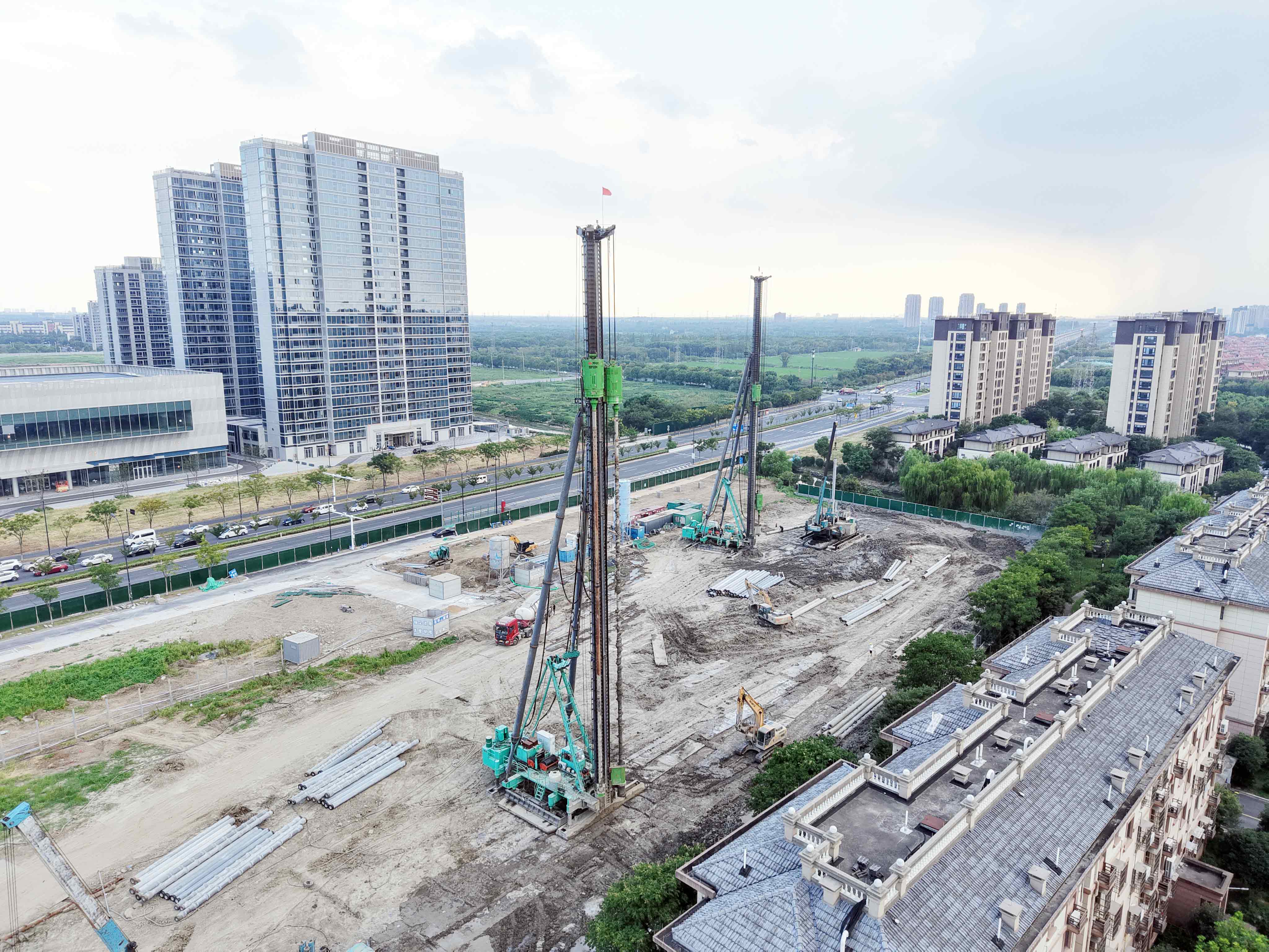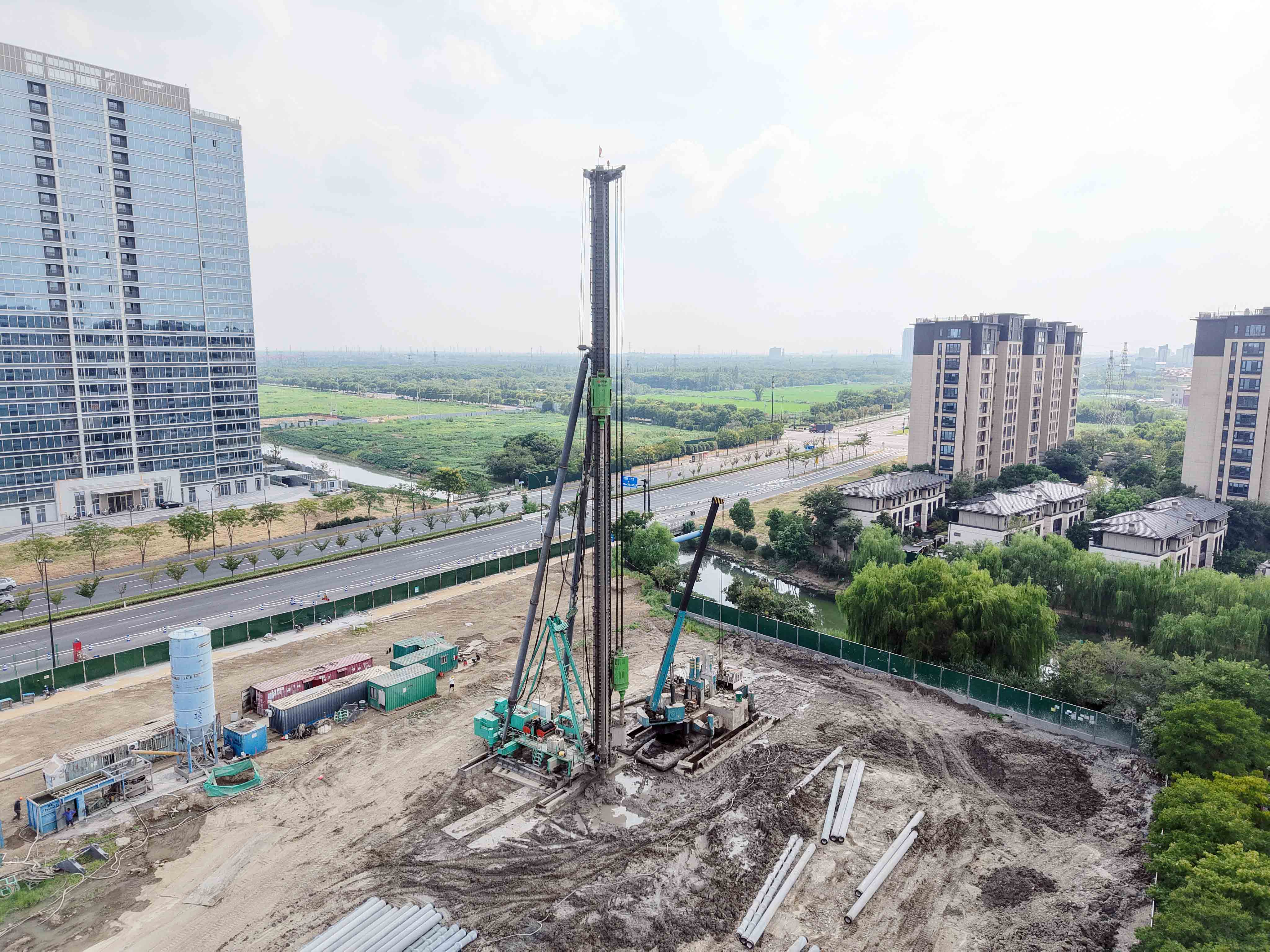 在空曠的工地中央,兩抹醒目的“湖水綠”靜立于天地之間,如兩位沉默的巨人,鉆頭平穩而有力地探向大地深處,為未來的商業樓宇與酒店打下堅實而綠色的根基。